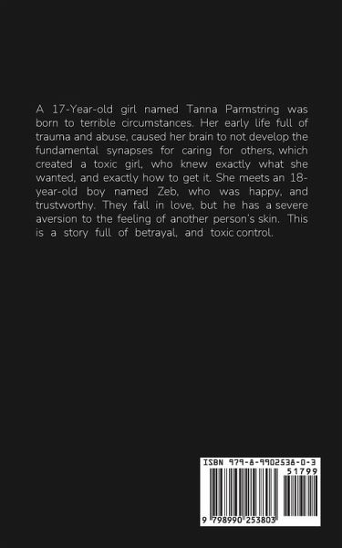 A 17-Year-old girl named Tanna Parmstring was born to terrible circumstances. Her early life full of trauma and abuse, caused her brain to not develop the fundamental synapses for caring for others, which created a toxic girl, who knew exactly what she wanted, and exactly how to get it. She meets an 18-year-old boy named Zeb, who was happy, and trustworthy. They fall in love, but he has a severe aversion to the feeling of another person's skin. This is a story full of betrayal, and toxic control.