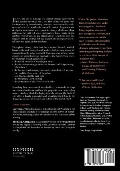 Cities have been destroyed throughout history. And yet in nearly every recent instance they have risen, phoenix-like from the ashes. This anthology, edited by Lawrence J Vale and Thomas J Campanella, explores the extraordinary resilience of modern cities, and the politics and processes that govern urban recovery in the wake of disaster, with case studies from around the globe.