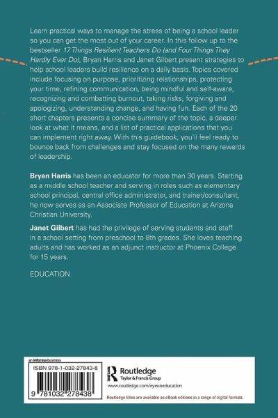 Learn practical ways to manage the stress of being a school leader so you can get the most out of your career. In this follow up to the bestseller 17 Things Resilient Teachers Do (and Four Things They Hardly Ever Do), Bryan Harris and Janet Gilbert present strategies to help school leaders build resilience on a daily basis. Topics covered include focusing on purpose, prioritizing relationships, protecting your time, refining communication, being mindful and self-aware, recognizing and combatting burnout, taking risks, forgiving and apologizing, understanding change, and having fun. Each of the 20 short chapters presents a concise summary of the topic, a deeper look at what it means, and a list of practical applications that you can implement right away. With this guidebook, you'll feel ready to bounce back from challenges and stay focused on the many rewards of leadership.