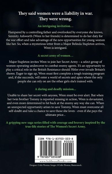 A gripping new story of courage and bravery from a wonderful new saga voice. Perfect for fans of Fenella J. Miller, Lizzie Lane and Rosie Clarke. They said women were a liability in war. They were wrong. An intriguing invitation... Hampered by a controlling father and overlooked by everyone she knows, Serenity Ashworth (Wren to her friends) is determined to do her duty for the war effort and take advantage of the new opportunities for young women like her. So, when a mysterious letter from a Major Belinda Stapleton arrives, Wren is intrigued. A secret army of women... Major Stapleton invites Wren to join her Secret Army - a select group of women operating undercover to combat enemy agents. It's an opportunity to play a critical role in the British Resistance should Hitler ever invade Britain's shores. Eager to sign up, Wren must first complete a tough training program and, if she succeeds, will enter a world of secrets and spies where the only people she can rely on are the other girls she's trained with. A daring and deadly mission Unable to share her secret with anyone, Wren must be ever alert. But when her twin brother Tommy is reported missing in action, Wren is devastated, and even more determined to hit back at the enemy any way she can. When an unexpected opportunity arises to save Tommy, Wren must overcome all self-doubt and take a chance to save those she loves - even if she pays the ultimate price... A gripping new saga series filled with courage and bravery inspired by the true-life stories of The Women's Secret Army. Perfect for fans of Fenella J. Miller, Lizzie lane and Rosie Clarke.