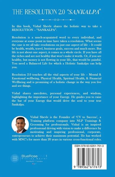In this book, Vishal Shevle shares the holistic way to take a RESOLUTION - "SANKALPA". Resolution is a much-acquainted word to every individual, and everyone at some point in time has taken a resolution. What seems the case is we all take resolutions on just one aspect of life - It could be health, wealth, travel, business goals, success, and much more. But life is not about one aspect, it comes as a whole circle. If you have all the riches and are not healthy that won't make it worth it. Or, if you are healthy, but money is not flowing in your life, that would be painful. You need a Balanced Life for which a Holistic Sankalpa can help you. Resolution 2.0 touches all the vital aspects of your life - Mental & Emotional well-being, Physical Health, Spiritual Health, & Financial well-being and promises a holistic change in the way you live and see things. Vishal shares anecdotes, personal experiences, and wisdom, highlighting the importance of your Energy. He guides you to raise the bar of your Energy that would drive the soul to your true Sankalpa.