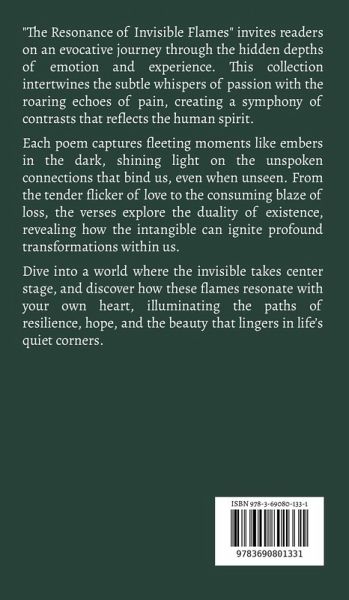 "The Resonance of Invisible Flames" invites readers on an evocative journey through the hidden depths of emotion and experience. This collection intertwines the subtle whispers of passion with the roaring echoes of pain, creating a symphony of contrasts that reflects the human spirit. Each poem captures fleeting moments like embers in the dark, shining light on the unspoken connections that bind us, even when unseen. From the tender flicker of love to the consuming blaze of loss, the verses explore the duality of existence, revealing how the intangible can ignite profound transformations within us. Dive into a world where the invisible takes center stage, and discover how these flames resonate with your own heart, illuminating the paths of resilience, hope, and the beauty that lingers in life's quiet corners.