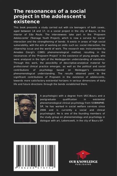 This book presents a study carried out with six teenagers of both sexes, aged between 14 and 17, in a social project in the city of Bauru, in the interior of São Paulo. The interviewees take part in the 'Projovem Adolescente' (Teenage Youth Project), which is now a service for social interaction and the strengthening of bonds. It exists in areas of high social vulnerability, with the aim of working on skills such as: social interaction, the citizenship issue and the world of work. The research was instrumented by Amedeo Giorgi's (1985) phenomenological method, resulting in the resonances of the 'Projovem Project' in the existence of young people, who were analysed in the light of the Heideggerian understanding of existence. Through this work, the possibility of descriptive-analytical material for professional clinical practice emerges, as well as the political and social contributions of psychology based on Heidegger's existential phenomenological understanding. The results obtained point to the significant contributions of Projovem in the existence of adolescents, towards more satisfactory existential horizons in various dimensions of daily life and future directions through the bonds established there.