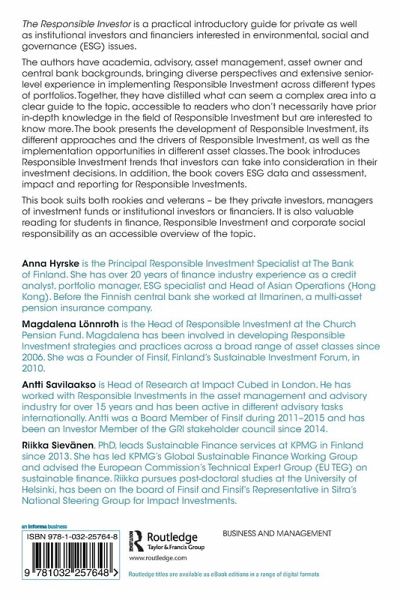 "The explosion of interest in Responsible Investment has resulted in numerous questions around how best to define it, which data sources to utilise or how to report on its effectiveness. This book should become the starting point for those questions and many more. Anna Hyrske, Magdalena Lönnroth, Antti Savilaakso and Riikka Sievänen have written on the topic in a thoughtful way that will be required reading for anyone interested in understanding how to develop and implement an ESG strategy in today's market environment. I highly recommend this book for laymen and practitioners alike!"