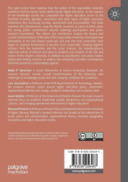 Chapter 1. Responsible universities in context: An introduction to the book; Lars Geschwind, Jouni Kekäle, Romulo Pinheiro and Mads P. Sørensen.- PART I. History and current transformations.- Chapter 2. The changing meanings of 'responsible university': From a Nordic-Keynesian welfare state to a Schumpeterian competition state; Mikko Kohvakka, Arto Nevala and Hanna Nori.- Chapter 3. The modernisation agenda and university irresponsibility repertoires; Paul Benneworth.- Chapter 4. Lost in transition? On the migration to English language research publication; Mads P. Sørensen, Mitchell Young and Pernille Bak Pedersen.- PART II. New innovations.- Chapter 5. Higher education: For free, for everyone, for real? Massive Open Online Courses (MOOCs) and the responsible university: History and enacting rationalities for MOOC-initiatives at three Swedish universities; Linda Barman, Cormac McGrath and Christian Stöhr.- Chapter 6. Co-creation with companies: A means to enhance the societal impact of university researchers?; Kirsi Pulkkinen and A. Hautamäki.- Chapter 7. Does a responsible university need a third mission?; James Karlsen and Miren Larrea.- PART III. Organising for responsibility.- Chapter 8. Technical education in jeapordy?: Assessing the interdisciplinary faculty structure in a university merger; Tea Vellamo, Elias Pekkola and Taru Siekkinen.- Chapter 9. Responsible university: In search of HR and leadership solutions; Jouni Kekäle and Jenni Varis.- Chapter 10. The responsible university in southeast Asia: A tale of the transition from an elite to a mass higher education system; Laila Nordstrand Berg, Rómulo Pinheiro, Puguh Prasetya Utomo and PradnikaYunic Nurhayati.- Chapter 11. Over the cuckoo's nest: Towards a Nordic model of the responsible university?;