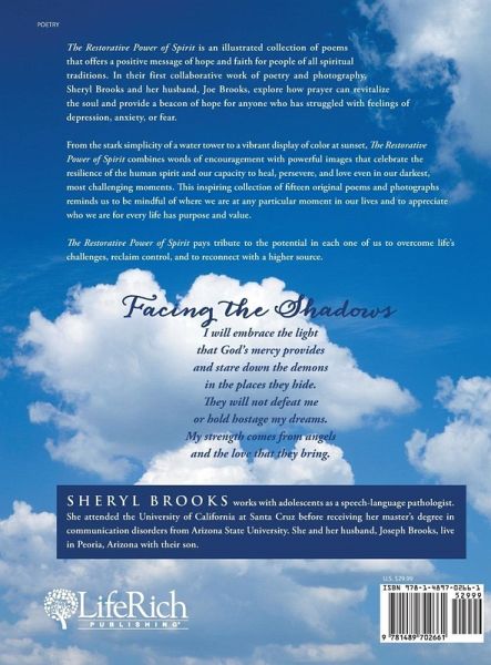 The Restorative Power of Spirit is an illustrated collection of poems that offers a positive message of hope and faith for people of all spiritual traditions. In their first collaborative work of poetry and photography, Sheryl Brooks and her husband, Joe Brooks, explore how prayer can revitalize the soul and provide a beacon of hope for anyone who has struggled with feelings of depression, anxiety, or fear. From the stark simplicity of a water tower to a vibrant display of color at sunset, The Restorative Power of Spirit combines words of encouragement with powerful images that celebrate the resilience of the human spirit and our capacity to heal, persevere, and love even in our darkest, most challenging moments. This inspiring collection of fifteen original poems and photographs reminds us to be mindful of where we are at any particular moment in our lives and to appreciate who we are for every life has purpose and value. The Restorative Power of Spirit pays tribute to the potential in each one of us to overcome life's challenges, reclaim control, and to reconnect with a higher source. Facing the Shadows I will embrace the light that God's mercy provides and stare down the demons in the places they hide. They will not defeat me or hold hostage my dreams. My strength comes from angels and the love that they bring.