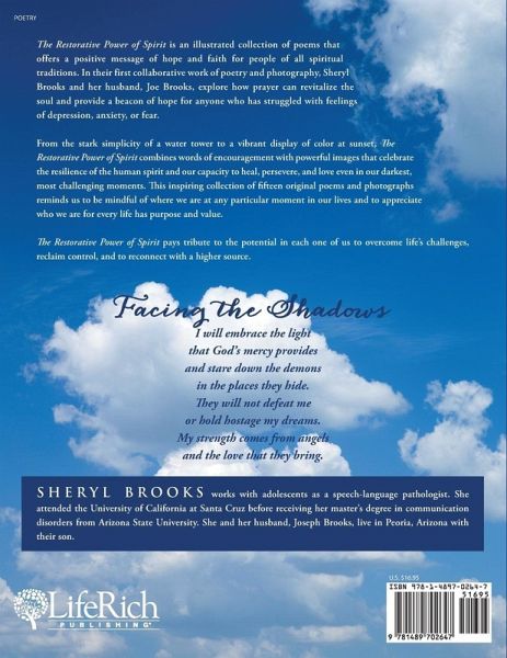 The Restorative Power of Spirit is an illustrated collection of poems that offers a positive message of hope and faith for people of all spiritual traditions. In their first collaborative work of poetry and photography, Sheryl Brooks and her husband, Joe Brooks, explore how prayer can revitalize the soul and provide a beacon of hope for anyone who has struggled with feelings of depression, anxiety, or fear. From the stark simplicity of a water tower to a vibrant display of color at sunset, The Restorative Power of Spirit combines words of encouragement with powerful images that celebrate the resilience of the human spirit and our capacity to heal, persevere, and love even in our darkest, most challenging moments. This inspiring collection of fifteen original poems and photographs reminds us to be mindful of where we are at any particular moment in our lives and to appreciate who we are for every life has purpose and value. The Restorative Power of Spirit pays tribute to the potential in each one of us to overcome life's challenges, reclaim control, and to reconnect with a higher source. Facing the Shadows I will embrace the light that God's mercy provides and stare down the demons in the places they hide. They will not defeat me or hold hostage my dreams. My strength comes from angels and the love that they bring.