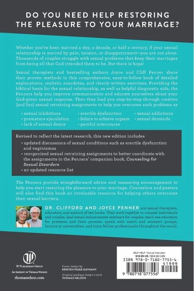Do you need help restoring the pleasure to your marriage? Whether you've been married a day, a decade, or half a century, if your sexual relationship is marred by pain, tension, or disappointment--you are not alone. Thousands of couples struggle with sexual problems that keep their marriages from being all that God intended them to be. But there is hope! Now, sexual therapists and best-selling authors Joyce and Cliff Penner share their proven methods in this comprehensive, easy-to-follow book of detailed explanations, realistic anecdotes, and clearly written exercises. Providing the biblical basis for the sexual relationship, as well as helpful diagnostic aids, the Penners help you improve communication and educate yourselves about your God-given sexual response. Then they lead you step-by-step through creative (and fun) sexual-retraining assignments to help you overcome various problems. The Penners provide straightforward advice and reassuring encouragement to help you start restoring the pleasure to your marriage. Beginning counselors and pastors will also find this an invaluable resource for helping others overcome their sexual barriers.