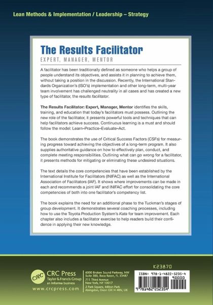 A facilitator has been traditionally defined as someone who helps a group of people understand their objectives, and assists them in planning to achieve them, without taking a position in the discussion. Recently, the International Standards Organization's (ISO's) implementation and other long-term, multi-year team involvement has challenged neutrality in all cases and has created a new type of facilitator, the results facilitator. The Results Facilitator: Expert, Manager, Mentor identifies the skills, training, and education that today's facilitators must possess. Outlining the new role of the facilitator, it presents powerful tools and techniques that can help facilitators achieve success. Continuous learning is a must and should follow the model-Learn-Practice-Evaluate-Act. The book demonstrates the use of Critical Success Factors (CSFs) for measuring progress toward achieving the objectives of a long-term program. It also supplies authoritative guidance on how to effectively plan, conduct, and complete meeting responsibilities. What can go wrong for a facilitator is outlined and methods to eliminate or mitigate these undesired situations are shown. The text details the core competencies that have been established by the International Institute for Facilitators (INIFAC) as well as the International Association of Facilitators (IAF). It shows where improvements can be made in each and recommends a joint IAF and INIFAC effort to consolidate into one facilitator's competency list. The book explains the need for an additional phase to the Tuckman's Group Dynamic Model. It shows several coaching processes including how to use the Toyota Production System's Kata for team improvement. The chapters have a facilitator exercise at the ends to help the reader apply their new knowledge to build their confidence and knowledge.