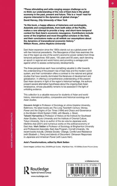 Giovanni Arrighi is professor of Sociology at The John Hopkins University, Baltimore. His latest books are The Long Twentieth Century: Money, Power and the Origins of Out Times (1994) and Chaos and Governance in the Modern World System (1999, with Beverly J Silver). Takeshi Hamashita is Professor of History at the Institute for Southeast Asian Studies, Kyoto University and the Institute of Oriental Culture, Tokyo University. He is co-author of the six volume Japanese work, Maritime Asia (2001) and numerous works on the political economy of East Asia. Mark Selden is Professor of Sociology at Binghamton University and Professional Associate, East Asia Program, Cornell University. His recent books include, Chinese Society: Change, Conflict and Resistance (with Elizabeth J Perry) and Islands of Discontent: Okinawan Responses to Japanese and American Power (with Laura Hein).