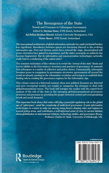 The transnational architecture of global information networks has made territorial borders less significant. Boundaries between spaces are becoming blurred in the evolving information age. But do information and communication technologies networks really lead to a weakening of the nation-state? This volume revisits the 'retreat of the state' thesis and tests its validity in the 21st century. It considers cyberspace as a matter of collective and policy choice, prone to usurpation by governance structures. Governments around the world are already reacting to the information revolution and trying to re-establish their leading role in creating governance regimes for the Information Age. The volume comes at a historical moment when new political dynamics are detected and new conceptual models are sought to categorize the attempts to deal with global/transnational issues. It will intrigue the reader with expert-level analysis of the role of the state in the emerging global/supranational governance structures by providing historical context and conceptualizing trends and social dynamics.