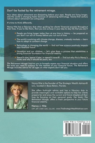 Don't be fooled by the retirement mirage. Are you still buying into the retirement mirage, hoping that, once you stop working, your life will be a perpetual enjoyment, exploration, and pleasant experience? It's time to think differently. Your ideas about retirement are dissipating before your eyes. People are living longer, and the world is changing faster because of advancing technology. Twenty-first century notions about retirement are antiquated. Nancy Hite has a fiduciary duty when guiding her clients' financial process throughout their lives. If you're like them, then you are so busy in your day-to-day life that you don't have time to think farther ahead than next week's paycheck. Nancy helps you: See ahead when you're too busy to look up®. In The Retirement Mirage, Nancy dissects the key points to help you think differently about your financial future. People are living longer today than at any time in history - be prepared so you don't run out of money before you run out of time The world is evolving with climate change, disease, unsteady markets - learn how to adapt to constant change Technology is changing the world - find out how science positively impacts your financial future Education and our children - let's give them a process that establishes a strong financial foundation for financial stability Spend it now, spend it later, or spend it never® - find out why this is Nancy's motto and why it should be yours, too The Retirement Mirage combines Nancy's years of financial expertise with real-life examples to show you a variety of perspectives. The Retirement Mirage will inspire you to honestly assess your financial situation and offers the tools you need to prepare for the realities of your financial future. The Retirement Mirage includes advice for all ages on what experts don't tell you.
