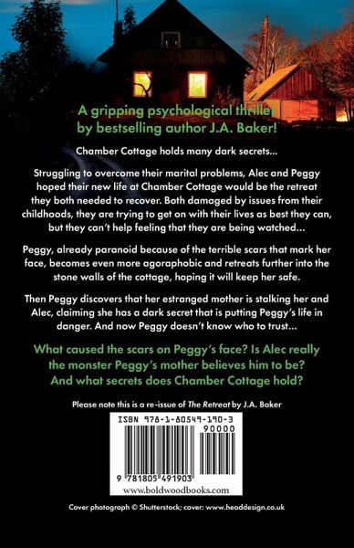 A gripping psychological thriller by bestselling author J.A. Baker! Chamber Cottage holds many dark secrets... Struggling to overcome their marital problems, Alec and Peggy hoped their new life at Chamber cottage would be the retreat they both needed to recover. Both damaged by issues from their childhoods, they are trying to get on with their lives as best they can, but they can't help feeling that they are being watched.... Peggy, already paranoid because of the terrible scars that mark her face, becomes even more agoraphobic and retreat further into the stone walls of the cottage, hoping it will keep her safe. Then Peggy discovers that her estranged mother is stalking her and Alec, claiming she has a dark secret that is putting Peggy's life in danger. And now Peggy doesn't know who to trust... What caused the scars on Peggy's face? Is Alec really the monster Peggy's mother believes him to be? And what secrets does Chamber Cottage hold? J.A. Baker is the bestselling author of The Woman at Number 19 and Local Girl Missing. The Retreat is a gripping and twisty psychological thriller which will appeal to fans of authors like SE Lynes and K.L. Slater. Please note this is a re-issue of The Retreat by J.A. Baker