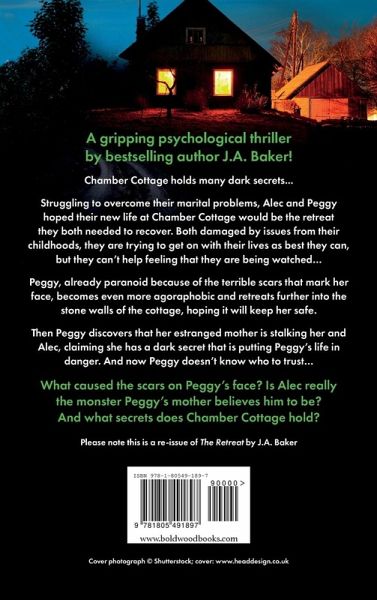 A gripping psychological thriller by bestselling author J.A. Baker! Chamber Cottage holds many dark secrets... Struggling to overcome their marital problems, Alec and Peggy hoped their new life at Chamber cottage would be the retreat they both needed to recover. Both damaged by issues from their childhoods, they are trying to get on with their lives as best they can, but they can't help feeling that they are being watched.... Peggy, already paranoid because of the terrible scars that mark her face, becomes even more agoraphobic and retreat further into the stone walls of the cottage, hoping it will keep her safe. Then Peggy discovers that her estranged mother is stalking her and Alec, claiming she has a dark secret that is putting Peggy's life in danger. And now Peggy doesn't know who to trust... What caused the scars on Peggy's face? Is Alec really the monster Peggy's mother believes him to be? And what secrets does Chamber Cottage hold? J.A. Baker is the bestselling author of The Woman at Number 19 and Local Girl Missing. The Retreat is a gripping and twisty psychological thriller which will appeal to fans of authors like SE Lynes and K.L. Slater. Please note this is a re-issue of The Retreat by J.A. Baker