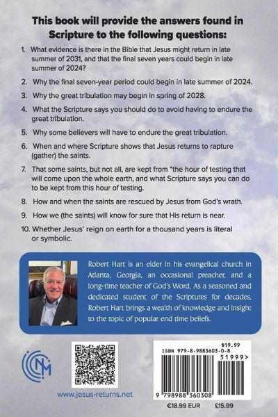 This book will provide the answers found in Scripture to the following questions: 1. What evidence is there in the Bible that Jesus could return as early as in the late summer of 2031? 2. Why the final seven-year period could begin in late summer of 2024? 3. Why the great tribulation may begin in spring of 2028? 4. What does the Scripture say you should do to avoid having to endure the great tribulation? 5. Why will some believers have to endure the great tribulation? 6. When and where does Scripture show that Jesus returns to rapture (gather) the saints? 7. Why are some saints, but not all, are kept from "the hour of testing that will come upon the whole earth", and what does Scripture says you can do to be kept from this hour of testing? 8. How and when the saints are rescued by Jesus from God's wrath? 9. How will we (the saints) know for sure that His return is near? 10. Whether Jesus' reign on earth for a thousand years is literal or symbolic. 11. Are there two resurrections (apart from Jesus' resurrection) and what the difference is between them? 12. Is there going to be an individual who is the Antichrist? If so, how can we recognize him? 13. When does God's wrath begin? 14. Can Jesus presently return at any moment? The Scriptures will be printed in the text with clear explanations as the topics are discussed so the reader will not be forced to look up the references. These and many other questions are addressed from a strictly Biblical standpoint. The chapters are for the most part stand alone, so the reader may digest these complex issues without having to read the entire book at one time.