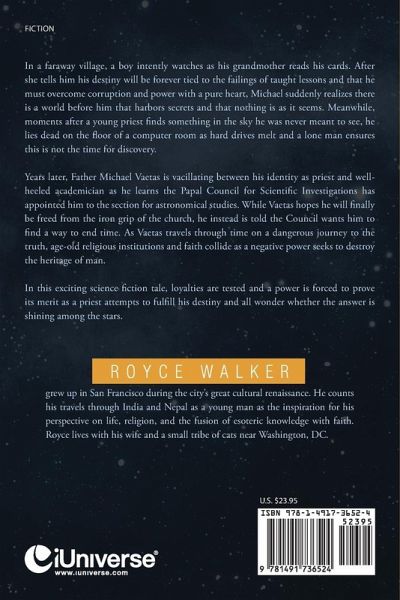 In a faraway village, a boy intently watches as his grandmother reads his cards. After she tells him his destiny will be forever tied to the failings of taught lessons and that he must overcome corruption and power with a pure heart, Michael suddenly realizes there is a world before him that harbors secrets and that nothing is as it seems. Meanwhile, moments after a young priest finds something in the sky he was never meant to see, he lies dead on the floor of a computer room as hard drives melt and a lone man ensures this is not the time for discovery. Years later, Father Michael Vaetas is vacillating between his identity as priest and well-heeled academician as he learns the Papal Council for Scientific Investigations has appointed him to the section for astronomical studies. While Vaetas hopes he will finally be freed from the iron grip of the church, he instead is told the Council wants him to find a way to end time. As Vaetas travels through time on a dangerous journey to the truth, age-old religious institutions and faith collide as a negative power seeks to destroy the heritage of man. In this exciting science fiction tale, loyalties are tested and a power is forced to prove its merit as a priest attempts to fulfill his destiny and all wonder whether the answer is shining among the stars.