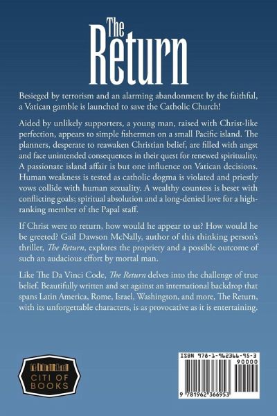 Besieged by terrorism and an alarming abandonment by the faithful, a Vatican gamble is launched to save the Catholic Church! Aided by unlikely supporters, a young man, raised with Christ-like perfection, appears to simple fishermen on a small Pacific island. The planners, desperate to reawaken Christian belief, are filled with angst and face unintended consequences in their quest for renewed spirituality. A passionate island affair is but one influence on Vatican decisions. Human weakness is tested as catholic dogma is violated and priestly vows collide with human sexuality. A wealthy countess is beset with conflicting goals; spiritual absolution and a long-denied love for a high-ranking member of the Papal staff. If Christ were to return, how would he appear to us? How would he be greeted? Gail Dawson McNally, author of this thinking person's thriller, The Return, explores the propriety and a possible outcome of such an audacious effort by mortal man. Like The Da Vinci Code, The Return delves into the challenge of true belief. Beautifully written and set against an international backdrop that spans Latin America, Rome, Israel, Washington, and more, The Return, with its unforgettable characters, is as provocative as it is entertaining.