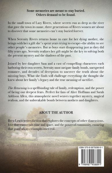 "Some memories are meant to stay buried. Others demand to be found." In the small town of Lazy Rivers, where secrets run as deep as the river that gave the town its name, three generations of Rivers women are about to discover that some memories can't stay buried forever. When Serenity Rivers returns home to care for her dying mother, she brings with her a gift she's spent years trying to escape-the ability to see other people's memories. But as boys start disappearing just as they did fifty years ago, Serenity realizes her gift might be the key to solving both the present mystery and the shadows of the past. Joined by her daughter Sam and a cast of compelling characters each harboring their own secrets, Serenity must navigate family bonds, unexpected romance, and decades of deception to uncover the truth about the missing boys. What she finds will challenge everything she thought she knew about her family's legacy and the true meaning of sacrifice. The Returning is a spellbinding tale of family, redemption, and the power of facing our deepest fears. Perfect for fans of Alice Hoffman and Sarah Addison Allen, this atmospheric novel weaves together mystery, magical realism, and the unbreakable bonds between mothers and daughters.