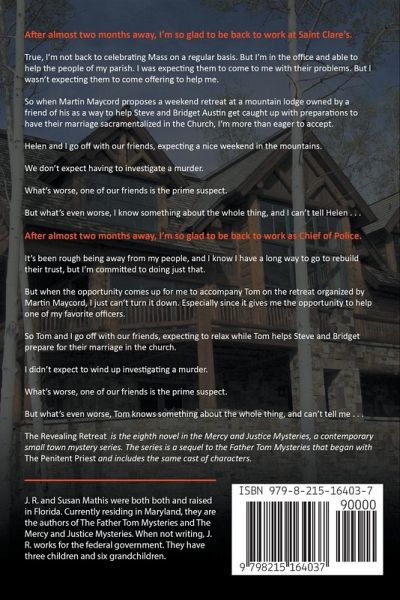 Enjoy this Small-Town Murder Mystery Featuring A Unique Sleuthing Couple. After almost two months away, I'm so glad to be back to work at Saint Clare's. True, I'm not back to celebrating Mass on a regular basis. But I'm in the office and able to help the people of my parish. I was expecting them to come to me with their problems. But I wasn't expecting them to come offering to help me. So when Martin Maycord proposes a weekend retreat at a mountain lodge owned by a friend of his as a way to help Steve and Bridget Austin get caught up with preparations to have their marriage sacramentalized in the Church, I'm more than eager to accept. Helen and I go off with our friends, expecting a nice weekend in the mountains. We don't expect having to investigate a murder. What's worse, one of our friends is the prime suspect. But what's even worse, I know something about the whole thing, and I can't tell Helen . . . After almost two months away, I'm so glad to be back to work as Chief of Police. It's been rough being away from my people, and I know I have a long way to go to rebuild their trust, but I'm committed to doing just that. But when the opportunity comes up for me to accompany Tom on the retreat organized by Martin Maycord, I just can't turn it down. Especially since it gives me the opportunity to help one of my favorite officers. So Tom and I go off with our friends, expecting to relax while Tom helps Steve and Bridget prepare for their marriage in the church. I didn't expect to wind up investigating a murder. What's worse, one of our friends is the prime suspect. But what's even worse, Tom knows something about the whole thing, and can't tell me . . . The Revealing Retreat is the eighth novel in the Mercy and Justice Mysteries, a contemporary small town mystery series. The series is a sequel to the Father Tom Mysteries that began with The Penitent Priest and includes the same cast of characters. It features Father Tom Greer, a Catholic Priest who is also an amateur sleuth in the tradition of Father Brown, and his wife Helen Greer, female Chief of Police and detective in the tradition of Kinsey Millhone.