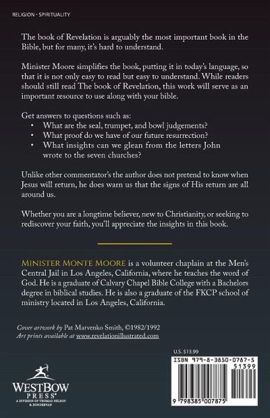 The book of Revelation is arguably the most important book in the Bible, but for many, it's hard to understand. Minister Moore simplifies the book, putting it in today's language, so that it is not only easy to read but easy to understand. While readers should still read The book of Revelation, this work will serve as an important resource to use along with your bible. Get answers to questions such as: ¿ What are the seal, trumpet, and bowl judgements? ¿ What proof do we have of our future resurrection? ¿ What insights can we glean from the letters John wrote to the seven churches? Unlike other commentator's the author does not pretend to know when Jesus will return, he does warn us that the signs of His return are all around us. Whether you are a longtime believer, new to Christianity, or seeking to rediscover your faith, you'll appreciate the insights in this book.