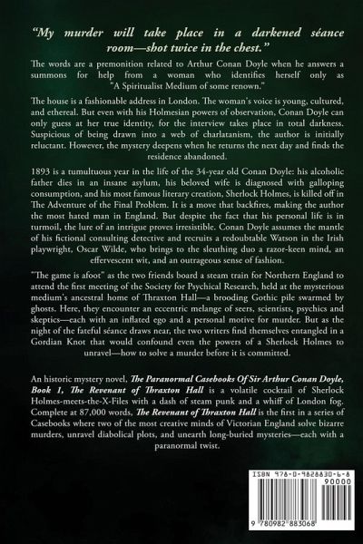 The Paranormal Casebooks of Sir Arthur Conan Doyle read like a volatile cocktail of Sherlock Holmes-meets-the-X-Files with a dash of horror and a whiff of London fog. Conan Doyle assumes the mantle of his fictional consulting detective and recruits a redoubtable Watson in the Irish playwright Oscar Wilde, who brings to the sleuthing duo a razor-keen mind, an effervescent wit, and an outrageous sense of fashion. Together, two of the greatest minds in Victorian England solve bizarre murders, unravel diabolical plots and unearth long-buried mysteries-each with a paranormal twist. The Revenant of Thraxton Hall "My murder will take place in a darkened séance room-shot twice in the chest." The words are a premonition related to Arthur Conan Doyle when he answers a summons for help from a woman who identifies herself only as "a Spiritualist Medium of some renown." The house is a fashionable address in London. The woman's voice is young, cultured and ethereal. But even with his Holmesian powers of observation, Conan Doyle can only guess at her true identity, for the interview takes place in total darkness. Suspicious of being drawn into a web of charlatanism, the author is initially reluctant. However, the mystery deepens when he returns the next day and finds the residence abandoned. 1893 is a tumultuous year in the life of the 34-year old Conan Doyle: his alcoholic father dies in an insane asylum, his wife is diagnosed with galloping consumption, and his most famous literary creation, Sherlock Holmes, is killed off in The Adventure of the Final Problem. It is a move that backfires, making the author the most hated man in England. But despite the fact that his personal life is in turmoil, the lure of an intrigue proves irresistible. Conan Doyle assumes the mantle of his fictional consulting detective and recruits a redoubtable Watson in the Irish playwright, Oscar Wilde, who brings to the sleuthing duo a razor-keen mind, an effervescent wit, and an outrageous sense of fashion. "The game is a afoot" as the two friends board a steam train for Northern England to attend the first meeting of the Society for Psychical Research, held at the mysterious medium's ancestral home of Thraxton Hall-a brooding Gothic pile swarmed by ghosts. Here, they encounter an eccentric mélange of seers, scientists, psychics and skeptics-each with an inflated ego and a motive for murder. As the night of the fateful séance draws near, the two writers find themselves entangled in a Gordian Knot that would confound even the powers of a Sherlock Holmes to unravel-how to solve a murder before it is committed."