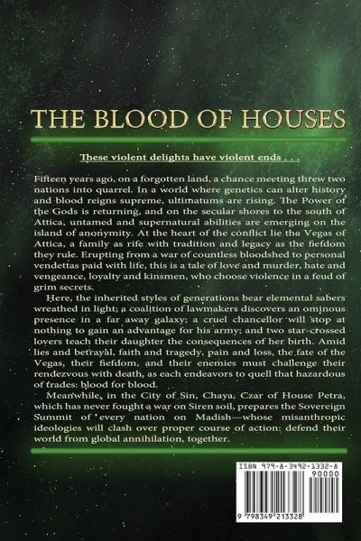 Game of Thrones with Lightsabers A secret is trivial for one, adequate for two, and fatal for three. There's power in blood. Such is the legacy of House Vega, a Sovereign fiefdom standing on the brink against General Basil Zeren of Taras. There, Jase Vega of Attica declares neutrality in his family's war, in vein and virtue. A militant pacifist, he ventures beyond the neon city to train his clandestine daughter, Seva, how to wield their inherited powers: the roaring tides of Hydrokinesis and the collateral-inducing damage of Super Strength. Far across the Royal Strait, along the secular shores of Siteia, lie devote conjurers and more-an innate power severed from the dynastic kings during the generation-long uprising, yet emerging with grievous consequences and divine authority not seen in centuries. But a more civil disturbance rises to the east, where Shoshana Vega, the General of War, has decreed an ultimatum for her heretic brother: join the destructive conflict or face execution for treason. Now, Basil is charging west to Attica, bringing his daughter, the apostatized but fierce Rome, her daughter, the infamous, immeasurable acolyte Seva, and the indomitable genetic powers of House Zeren-the first an inferno like Dragon's breath, the second a psionic enhancement of hearing. All are colliding in Attica, unaware of a fifteen-year mystery condemning Seva's birthright that will link the two feuding houses in blood forever. Meanwhile, in the City of Sin, Chaya, Czar of House Petra, which has never fought a war on Siren soil, prepares the Sovereign Summit of every nation on Madish-whose misanthropic ideologies will clash over proper course of action: defend their world from global annihilation, together. The Blood of Houses Volume II will be released in 2025. This novel features supernatural abilities, battle sequences, and political intrigue.
