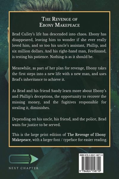 Brad Culley's life has descended into chaos. Ebony has disappeared, leaving him to wonder if she ever really loved him, and so too his uncle's assistant, Phillip, and six million dollars. And his right-hand man, Ferdinand, is testing his patience. Nothing is as it should be. Meanwhile, as part of her plan for revenge, Ebony takes the first steps into a new life with a new man, and uses Brad's inheritance to achieve it. As Brad and his friend Sandy learn more about Ebony's and Phillip's deceptions, the opportunity to recover the missing money, and the fugitives responsible for stealing it, diminishes. Depending on his uncle, his friend, and the police, Brad waits for justice to be served. This is the large print edition of The Revenge of Ebony Makepeace, with a larger font / typeface for easier reading.