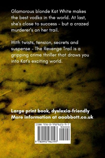 Don't you wish print was easier to read? Here's your answer! This pacy crime thriller has been published in a LARGE PRINT format that's dyslexia-friendly too. She dreamed of making vodka to die for. With a killer on her trail, will the taste of success spell her doom? Glamorous Kat White has finally made it big. Her craft vodka brand and her life are going places, while the mother who abandoned her faces financial ruin. Then Kat's shady sales partner admits he's about to go under. With her business on the line, Kat warily agrees to front a fancy ad campaign. After all, the stalker who shot at her is safely behind bars, so what can possibly go wrong? As a cold-blooded killer plans his jailbreak, Kat dreams of love and success. Perhaps she should just focus on staying alive... Fourth in the compelling Trail series of British crime thrillers, The Revenge Trail sizzles with secrets, suspense and twists. Thrill to the excitement of Kat's dramatic life - get your copy today! Printed in Lexend 14 point with 1.5 line spacing. The large print in sans serif font, wide line spacing, cream paper and short chapters make this edition a breeze to read. Helpful to readers with visual impairment or visual stress, and dyslexic readers. Also available in traditional paperback and e-book formats.