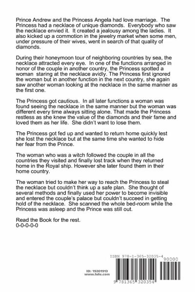 Prince Andrew and the Princess Angela had love marriage. The Princess had a necklace of unique diamonds. Everybody who saw the necklace envied it. It created a jealousy among the ladies. It also kicked up a commotion in the jewellary market when some men, under pressure of their wives, went in search of that quality of diamonds. During their honeymoon tour of neighboring countries by sea, the necklace attracted every eye. In one of the functions arranged in honor of the couple in another country, the Princess spotted a woman staring at the necklace avidly. The Princess first ignored the woman but in another function in the next country, she again saw another woman looking at the necklace in the same manner as the first one. The Princess got cautious. In all later functions a woman was found seeing the necklace in the same manner but the woman was different every time always sitting alone. That made the Princess restless as she knew the value of the diamonds and their fame and loved them as her life.