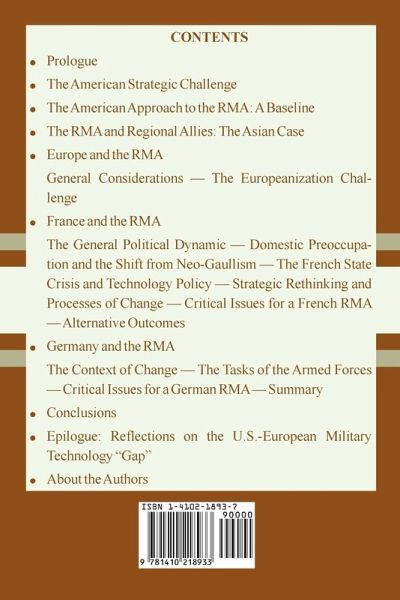 CONTENTS: Prologue The American Strategic Challenge The American Approach to the RMA: A Baseline The RMA and Regional Allies: The Asian Case Europe and the RMA General Considerations --- The Europeanization Challenge France and the RMA The General Political Dynamic --- Domestic Preoccupation and the Shift from Neo-Gaullism --- The French State Crisis and Technology Policy --- Strategic Rethinking and Processes of Change --- Critical Issues for a French RMA --- Alternative Outcomes Germany and the RMA The Context of Change --- The Tasks of the Armed Forces --- Critical Issues for a German RMA --- Summary Conclusions Epilogue: Reflections on the U.S -European Military Technology "Gap" About the Authors