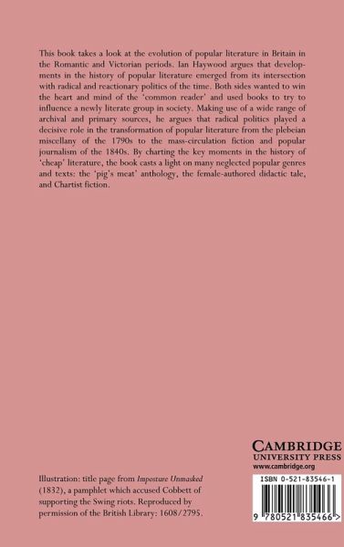 This book takes a new look at the evolution of popular literature in Britain in the Romantic and Victorian periods. Ian Haywood argues that developments in the history of popular literature emerged from its intersection with radical and reactionary politics of the time. Both sides wanted to win the heart and mind of the 'common reader' and used books to try to influence a newly literate group in society. Making use of a wide range of archival and primary sources, he argues that radical politics played a decisive role in the transformation of popular literature from the plebeian miscellany of the 1790s to the mass-circulation fiction and popular journalism of the 1840s. By charting the key moments in the history of 'cheap' literature, the book casts new light on the many neglected popular genres and texts: the 'pig's meat' anthology, the female-authored didactic tale, and Chartist fiction.