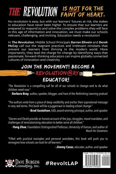 The Revolution is not for the faint of heart. No revolution is easy, but with our learners’ futures at risk, the stakes in education have never been higher. To ensure that our learners are prepared to respond to and solve the complex problems they will face in this age of information and innovation, we must make our schools relevant, challenging, and inviting. Education needs a revolution! In The Revolution, Middle School Principals Darren Ellwein and Derek McCoy call out the stagnant practices and irrelevant mindsets that prevent our learners from thriving in the modern world. More importantly, they lead the charge for change by identifying ways that passionate, forward-thinking educators can inspire globally connected cultures of innovation and creativity. Join the movement! Become a revolution@ry educator! "The Revolution is a compelling call for all of our schools to change—and to do what children need now." —Barbara Bray, author, speaker, blogger, and host of the Rethinking Learning podcast "The authors write from a place of deep credibility and anchor their aspirational message in very real terms. This book will be a juggernaut in leading school change." —Brad Gustafson, EdD, award-winning principal, author, and speaker "Darren and Derek provide an honest account of the joys, struggles, moral mandates, and challenges of revolutionizing education to better serve all children." —Yong Zhao, Foundation Distinguished Professor, University of Kansas, and author of Reach for Greatness "Filled with practical examples and personal anecdotes, this book will push you to reimagine how schools can look for all learners." —Jimmy Casas, educator, author, and speaker