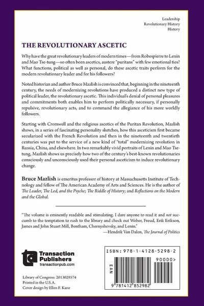 Why have the great revolutionary leaders of modern times-from Robespierre to Lenin and Mao Tse-tung-so often been ascetics, austere "puritans" with few emotional ties? What functions, political as well as personal, do these ascetic traits perform for the modern revolutionary leader and for his followers? Noted historian and author Bruce Mazlish is convinced that, beginning in the nineteenth century, the needs of modernizing revolutions have produced a distinct new type of political leader, the revolutionary ascetic. This individual's denial of personal pleasures and commitments both enables him to perform politically necessary, if personally repulsive, revolutionary acts, and to command the allegiance of his more worldly followers. Starting with Cromwell and the religious ascetics of the Puritan Revolution, Mazlish shows, in a series of fascinating personality sketches, how this asceticism first became secularized with the French Revolution and then in the nineteenth and twentieth centuries was put to the service of a new kind of "total" modernizing revolution in Russia, China, and elsewhere. In two remarkably vivid portraits of Lenin and Mao Tse-tung, Mazlish shows us precisely how two of the century's best-known revolutionaries consciously and unconsciously used their personal asceticism to induce revolutionary change.