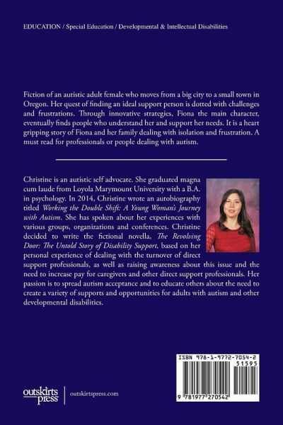 The Revolving Door, the Untold Story of Disability Supports is a story of a young adult woman trying to find good support people who are committed to helping her. Many leave the field because of poor pay and high stress. This is a raw honest story depicting young adults with developmental disabilities who are aging out of the system. These adults are left alone with very little support. Isolation is common with adults with developmental disabilities. Statistics show that in the coming years there will be a tsunami of children with autism growing up to be young adults. Our current social welfare system is not equipped to handle this tsunami coming our way. The author wants to advocate for better pay and incentive for people entering the direct support professional field. It is a MUST READ for anyone who deals with people with disabilities. Although the book deals with serious topics, the author imparts humor and honesty to engage with the reader.