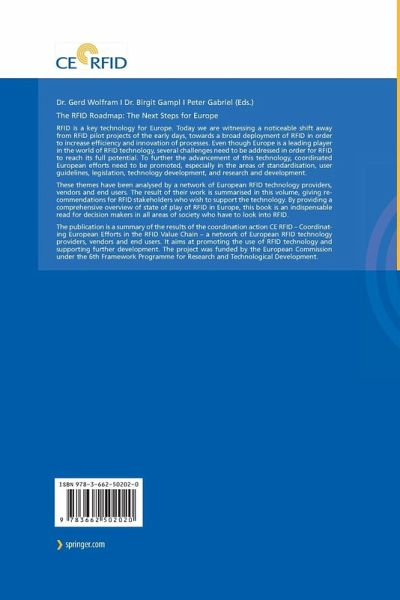 To further the advancement of this technology, coordinated European efforts need to be promoted, specifically in the areas of standardisation, user guidelines, legislation, technology development, and research and development. These themes have been analysed, and clear recommendations have been derived, stating what the different RFID stakeholders can do to support the technology. This book is aimed at decision makers in all fields of society, e.g. in companies, politics, business associations, etc.