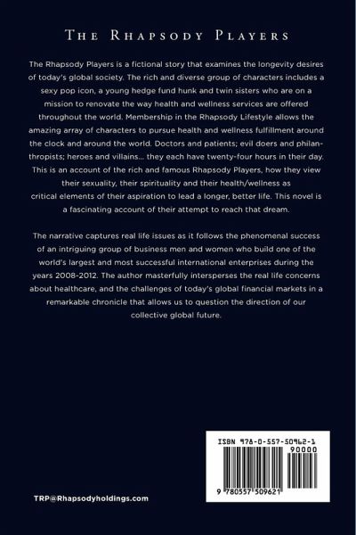 The Rhapsody players is a captivating story about how a fascinating group of characters create a springboard to longevity. The story examines the choices they make with respect to their own health, wellness, sexuality and spirituality, even as they build a business that provides these choices to others. The novel is rich with vibrant characters whom you quickly learn to love or to despise. All of this is achieved in a global setting, replete with the issues that face the world during the years 2008 through 2012.