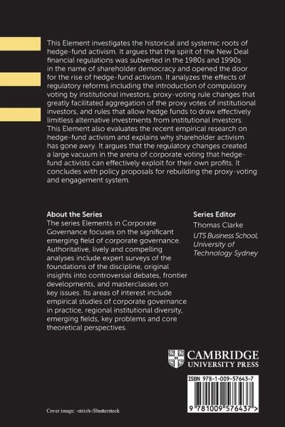 This Element investigates the historical and systemic roots of hedge-fund activism. It argues that the spirit of the New Deal financial regulations was subverted in the 1980s and 1990s and opened the door for the rise of hedge-fund activism. It concludes with policy proposals for rebuilding the proxy-voting and engagement system.