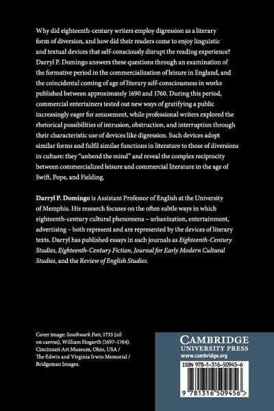 Why did eighteenth-century writers employ digression as a literary form of diversion, and how did their readers come to enjoy linguistic and textual devices that self-consciously disrupt the reading experience? Darryl P. Domingo answers these questions through an examination of the formative period in the commercialization of leisure in England, and the coincidental coming of age of literary self-consciousness in works published between approximately 1690 and 1760. During this period, commercial entertainers tested out new ways of gratifying a public increasingly eager for amusement, while professional writers explored the rhetorical possibilities of intrusion, obstruction, and interruption through their characteristic use of devices like digression. Such devices adopt similar forms and fulfil similar functions in literature as do diversions in culture: they 'unbend the mind' and reveal the complex reciprocity between commercialized leisure and commercial literature in the age of Swift, Pope, and Fielding.