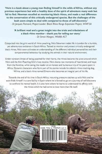 Catapulted into the grim world of rhino poaching, Nick Newman trades life in London for a humble, yet adventurous existence in South Africa. Tasked to monitor and protect critically endangered black rhinos, Nick soon cultivates an understanding of the different individual personalities and their temperamental behaviour by studying the animals in their natural environment. Under constant threat of being poached for their horns, the rhinos become the pivot around which Nick and the Anti-Poaching Unit's lives revolve. Nick shares raw moments of heartbreak and hope from the frontline, while taking the reader on an honest and humorous trip of his years spent in Africa. Dynamic characters who form part of his stories include his sidekick rhino-tracking dog, Wilma, and a black rhino named Elmore who becomes an integral part of his life. Towards the end of his time in South Africa, mounting pressure catches up with Nick and he soon finds himself in a care facility in Spain where he is forced to go on a journey of self-discovery to confront his mental health. It is also here where he learns to understand his affinity with the rhinos which he had come to love more than life itself.