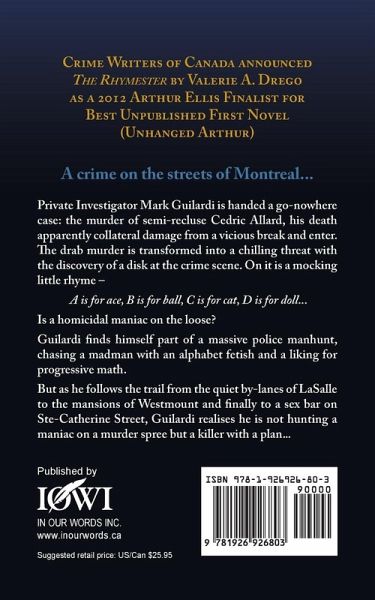 A detective crime investigation novel. First book in the Mark Guilardi Investigation series by Montreal-based author Valerie Drego. Story based in Montreal, Quebec. Private Investigator Mark Guilardi is handed a go-nowhere case: the murder of semi-recluse Cedric Allard, his death apparently collateral damage from a vicious break and enter. The drab murder is transformed into a chilling threat with the discovery of a disk at the crime scene. On it is a mocking little rhyme – A is for ace, B is for ball, C is for cat, D is for doll... Is a homicidal maniac on the loose? Guilardi finds himself part of a massive police manhunt, chasing a madman with an alphabet fetish and a liking for progressive math. But as he follows the trail from the quiet by-lanes of LaSalle to the mansions of Westmount and finally to a sex bar on Ste-Catherine Street, Guilardi realises he is not hunting a maniac on a murder spree but a killer with a plan...