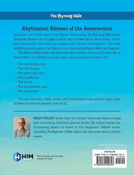 Rhythmical Rhymes of the Resurrection Introduce your little ones to the Easter story using The Rhyming Bible Easter Storybook. Parents can struggle to teach their children about Jesus' death, burial, and resurrection, but with fun rhymes and colorful illustrations, this book delightfully aids parents for family story time during Easter Week and beyond. The Rhyming Bible Easter Storybook has seven stories, one story for each day of Easter Week, so children can learn about these moments in Jesus' life: The triumphal entry, The Last Supper, The arrest and trial, The crucifixion, The burial, The resurrection, and The ascension! Fun and accurate, these stories and illustrations help parents teach their children to love the greatest story of all.