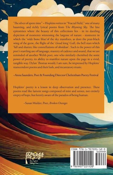 The silver of spent time' - Hopkins writes in "Fractal Field," one of many haunting, and richly lyrical poems from The Rhyming Sky. The line epitomises where the beauty of this collections lies - in its dazzling depiction of moments witnessing the largesse of nature - moments in which the 'wide bone blue' of the sky transfixes, as does the peat-black wing of the geese, the flight of the 'cloud king' Gull, the bell stars which 'fall and shatter, like constellations of obsidian'. Such is the power of this poet's startling use of language, mastery of cadence and sound, that we are reminded of another Welsh poet, one who similarly cherished the sonic power of poetry, its ability to manifest nature upon the page in a vivid, tangible way. Dylan Thomas would, I am sure, be impressed by Hopkins' transcendent poems and their lush, and incantatory music. ~Anna Saunders, Poet & Founding Director Cheltenham Poetry Festival.