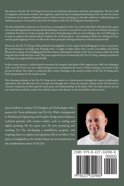 My journey with the Tao Te Ching has been one of profound exploration and deep contemplation. The text, with its enigmatic and timeless wisdom, has long been a guide for those seeking understanding of the Tao and the nature of existence. In my quest to bring the essence of these ancient teachings to a broader audience, I embarked upon an ambitious project: to transcribe each of the 81 chapters of the Tao Te Ching into rhyming verses. The idea behind this endeavour was born from a contemplation of the Tao itself, which flows effortlessly like a great river, meandering and intertwining with the landscape of our lives. In much the same way, the art of rhyme introduces a rhythmic harmony to words, creating a flow that is both pleasing to the ear and soothing to the soul. Rhyming, in its essence, captures the natural cadence found in the world around us - the chirping of birds, the rustling of leaves, and the gentle lapping of waves. It reflects the Taoist principle of living in harmony with the natural world. Moreover, the Tao Te Ching, while profound and insightful, can be cryptic and challenging for many to penetrate. By transforming its teachings into rhyming verses, I sought to imbue them with a certain accessibility and charm. Rhyme has a unique way of lodging itself in the memory, allowing the wisdom of the Tao to resonate within the mind long after the words have been read. This poetic approach serves to demystify the Tao Te Ching, making its profound teachings more approachable and relatable. In this creative process, I endeavoured to maintain the integrity and depth of the original text, while also infusing it with a new life. Each verse was crafted with great care, ensuring that the essence of the teachings was not lost in the pursuit of rhyme. The result is a collection that is both a homage to the ancient wisdom of the Tao Te Ching and a fresh interpretation for the modern seeker. This rhyming rendition of the Tao Te Ching invites readers on a lyrical journey through the realms of philosophy, spirituality, and self-reflection. It is my hope that through these verses, the timeless wisdom of the Tao becomes a constant companion in their quest for inner peace and understanding. In the spirit of the Tao, these rhymes are not just words to be read, but a path to be walked, a dance to be danced, in the eternal flow of the universe.