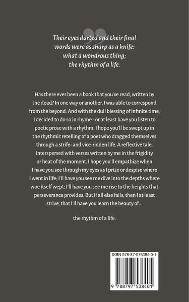 How would a weathered poet tell their life's tale? Would they write prose, poetry, or perhaps both? In The Rhythm Of A Life, poems that shine a bright light on life's lows and highs are woven together with poetic prose. The moments of intense emotion are connected through the rhythmic retelling of a poet from a land beyond death. Birth, youth, love, loss, escape, confrontation, parenting, and more are explored until the unwavering clutch of Death brings the poet back to where all things began. The captivating story will have you at the edge of your seat as you tap your feet to your heart's increasing beat. Where did they go right? Where did they go wrong? What is their life's insight? Were they weak or were they strong? Find out by picking up a copy today, and learn the wonders of: The rhythm of a life