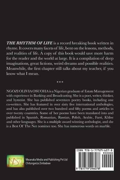The Rhythm of Life is a record breaking book written in rhyme. It covers many facets of life, bent on the lessons, methods, and realities of life. Ngozi Olivia Osuoha is a poet, writer, thinker, and hymnist. She has published seventeen poetry books, including one co-written. She has featured in over sixty five international anthologies, and has also published over two hundred and fifty poems and articles in over twenty countries.