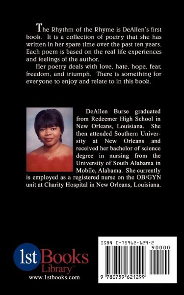 The Rhythm of the Rhyme is DeAllenâ¿¿s first book. It is a collection of poetry that she has written in her spare time over the past 10 years. Each poem is bused on the real life experiences and feelings of the author.