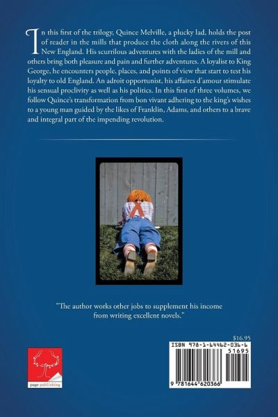 In this first of the trilogy, Quince Melville, a plucky lad, holds the post of reader in the mills that produce the cloth along the rivers of this New England. His scurrilous adventures with the ladies of the mill and others bring both pleasure and pain and further adventures. A loyalist to King George, he encounters people, places, and points of view that start to test his loyalty to old England. An adroit opportunist, his affaires d'amour stimulate his sensual proclivity as well as his politics. In this first of three volumes, we follow Quince's transformation from bon vivant adhering to the king's wishes to a young man guided by the likes of Franklin, Adams, and others to a brave and integral part of the impending revolution.