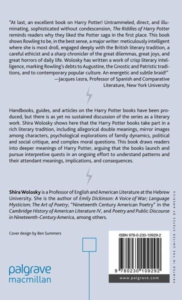 'At last, an excellent book on Harry Potter! Untrammelled, direct, and illuminating, sophisticated without condescension, The Riddles of Harry Potter reminds readers why they liked the Potter saga in the first place. This book shows Rowling to be, in the best sense, a major writer: meticulously intelligent where she is most droll, engaged deeply with the British literary tradition, a careful ethicist and a sharp chronicler of the great dilemmas, great joys, and great horrors of daily life. Wolosky has written a work of crisp literary intelligence, marking Rowling's debts to Augustine, the Gnostic and Patristic traditions, and to contemporary popular culture. An energetic and subtle braid!' - Jacques Lezra, Professor of Spanish and Comparative Literature, New York University, USA