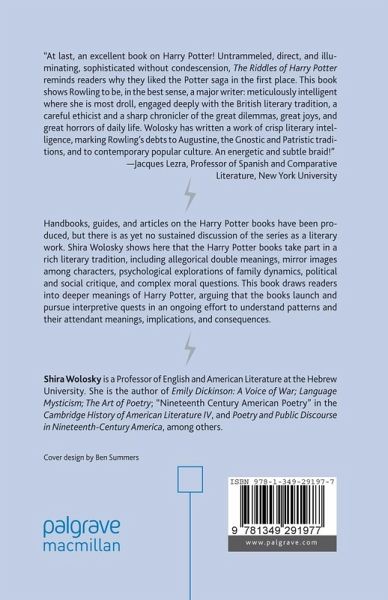 'At last, an excellent book on Harry Potter! Untrammelled, direct, and illuminating, sophisticated without condescension, The Riddles of Harry Potter reminds readers why they liked the Potter saga in the first place. This book shows Rowling to be, in the best sense, a major writer: meticulously intelligent where she is most droll, engaged deeply with the British literary tradition, a careful ethicist and a sharp chronicler of the great dilemmas, great joys, and great horrors of daily life. Wolosky has written a work of crisp literary intelligence, marking Rowling's debts to Augustine, the Gnostic and Patristic traditions, and to contemporary popular culture. An energetic and subtle braid!' - Jacques Lezra, Professor of Spanish and Comparative Literature, New York University, USA
