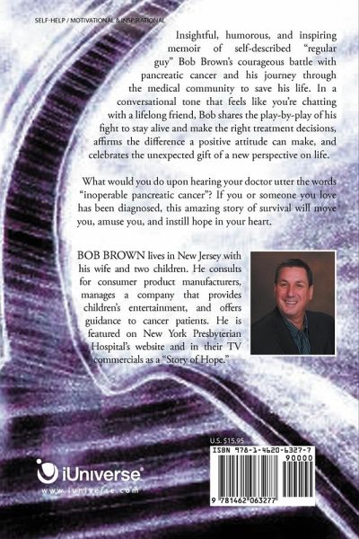 Insightful, humorous, and inspiring memoir of self-described "regular guy" Bob Brown's courageous battle with pancreatic cancer and his journey through the medical community to save his life. In a conversational tone that feels like you're chatting with a lifelong friend, Bob shares the play-by-play of his fight to stay alive and make the right treatment decisions, affirms the difference a positive attitude can make, and celebrates the unexpected gift of a new perspective on life. What would you do upon hearing your doctor utter the words "inoperable pancreatic cancer"? If you or someone you love has been diagnosed, this amazing story of survival will move you, amuse you, and instill hope in your heart.